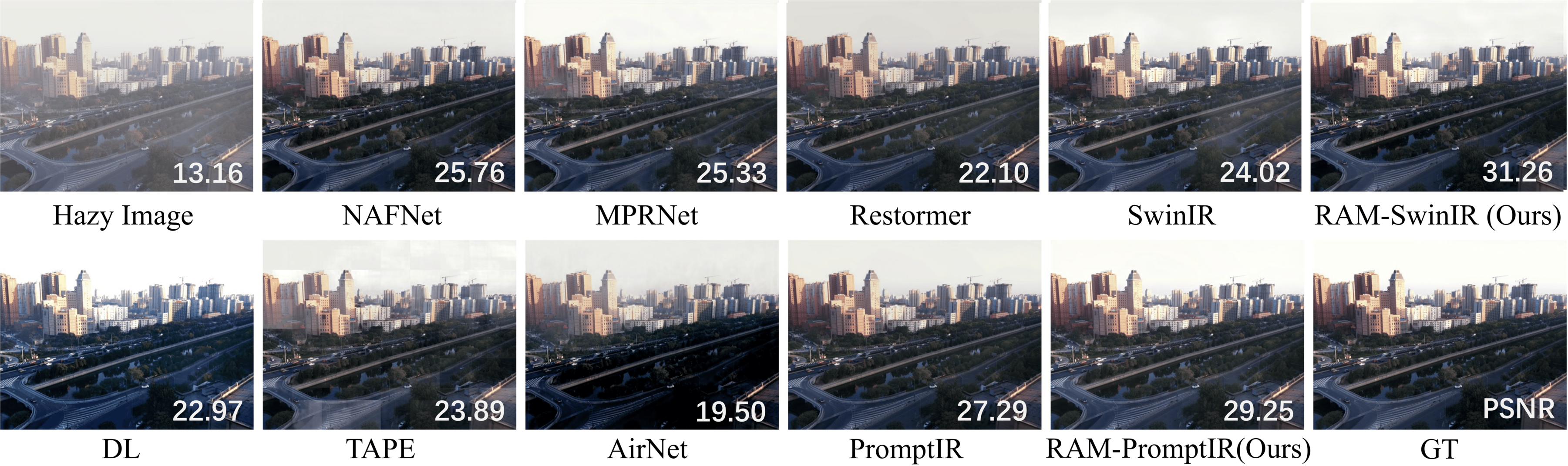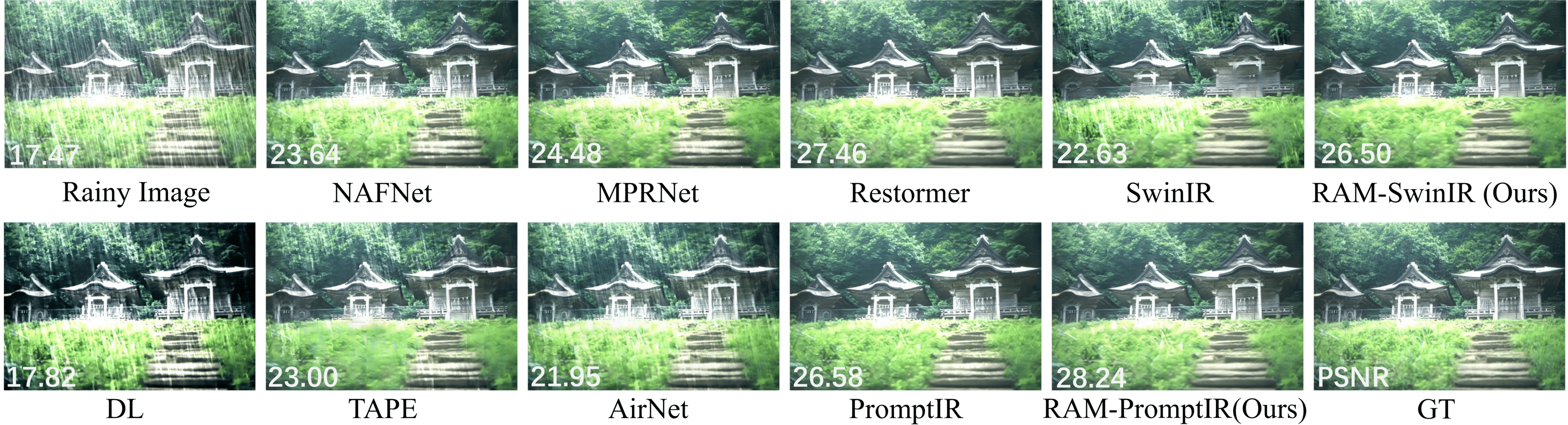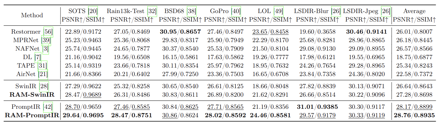 including dehazing, deraining, denoising, motion deblurring,