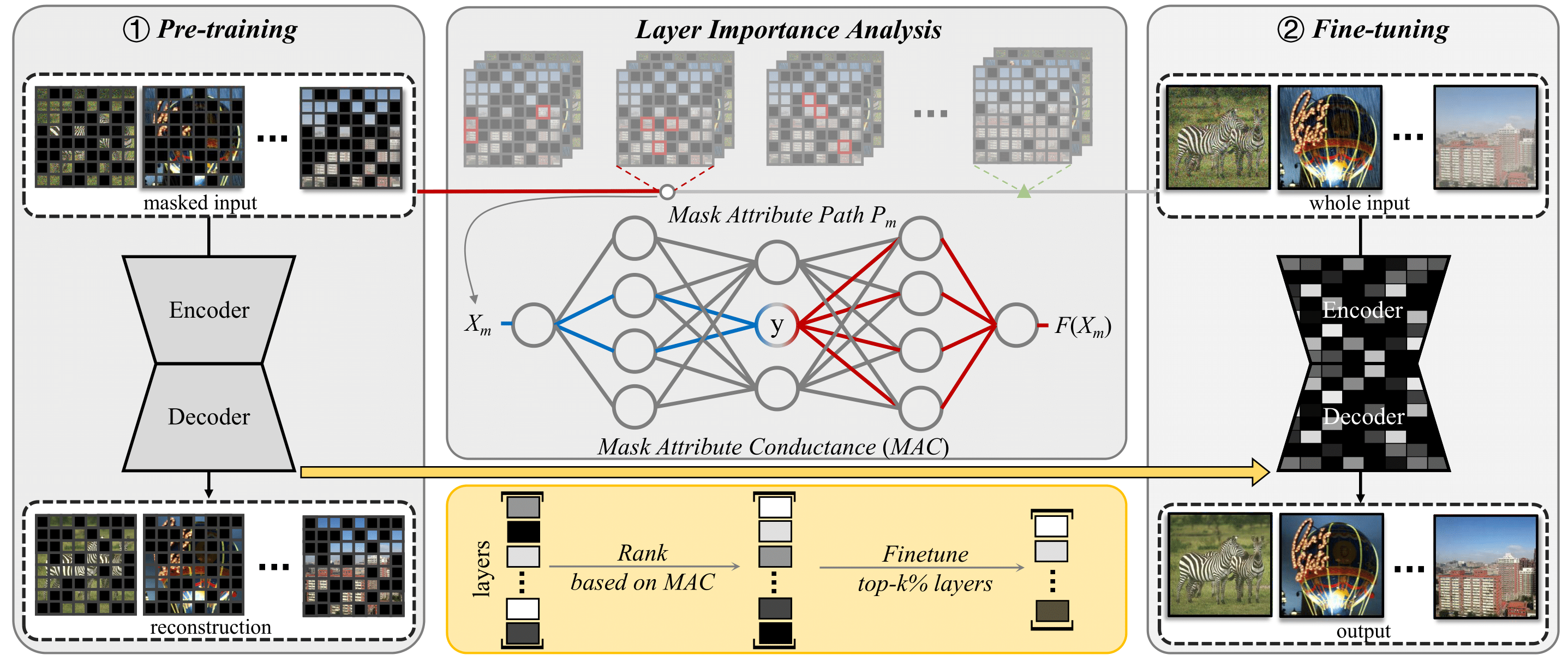 We analyze the importance of each network layer for resolving the input integrity gap according to the proposed MAC and rank them in descending order. The top k% of network layers are selected for fine-tuning on the complete image.